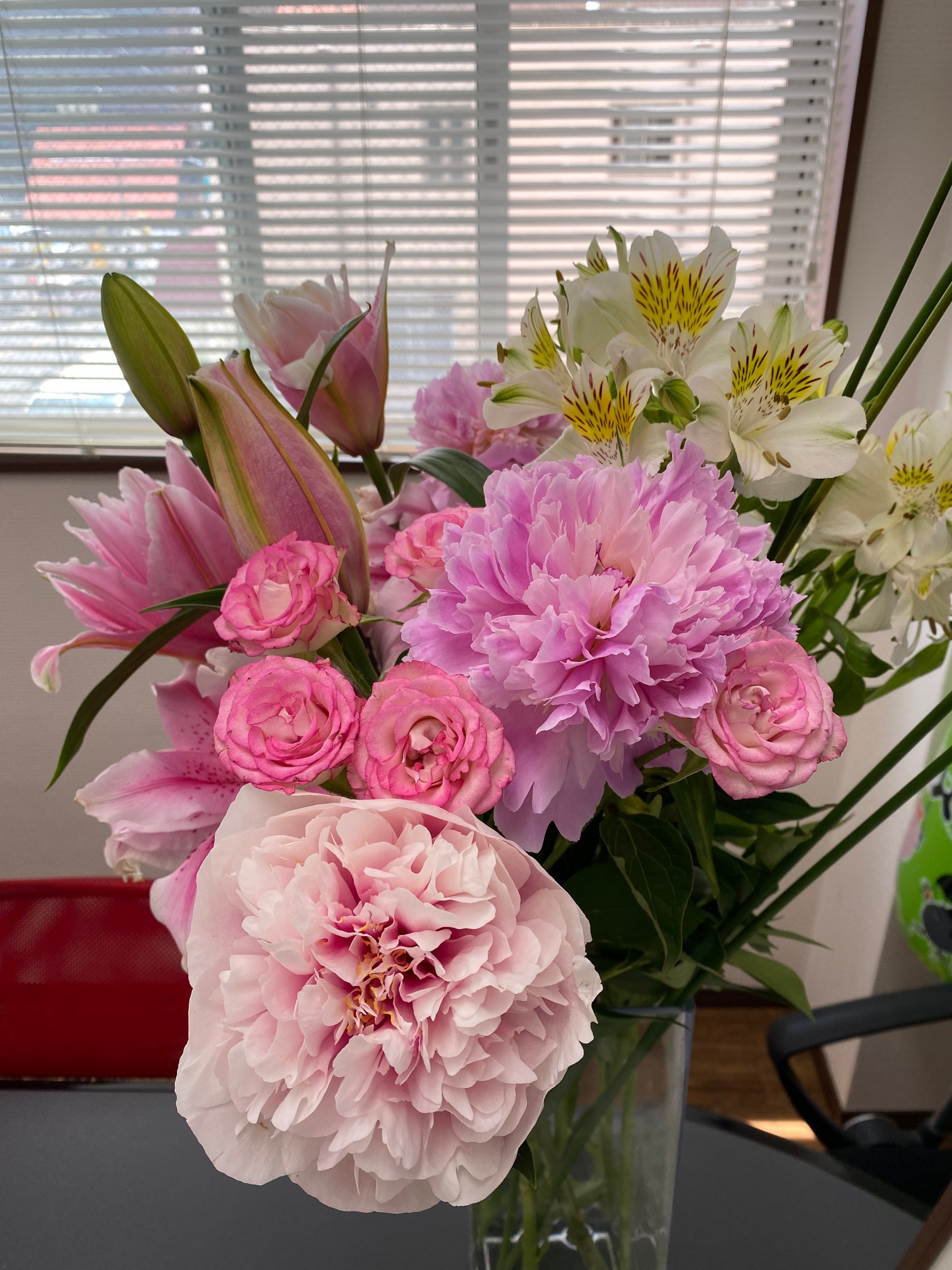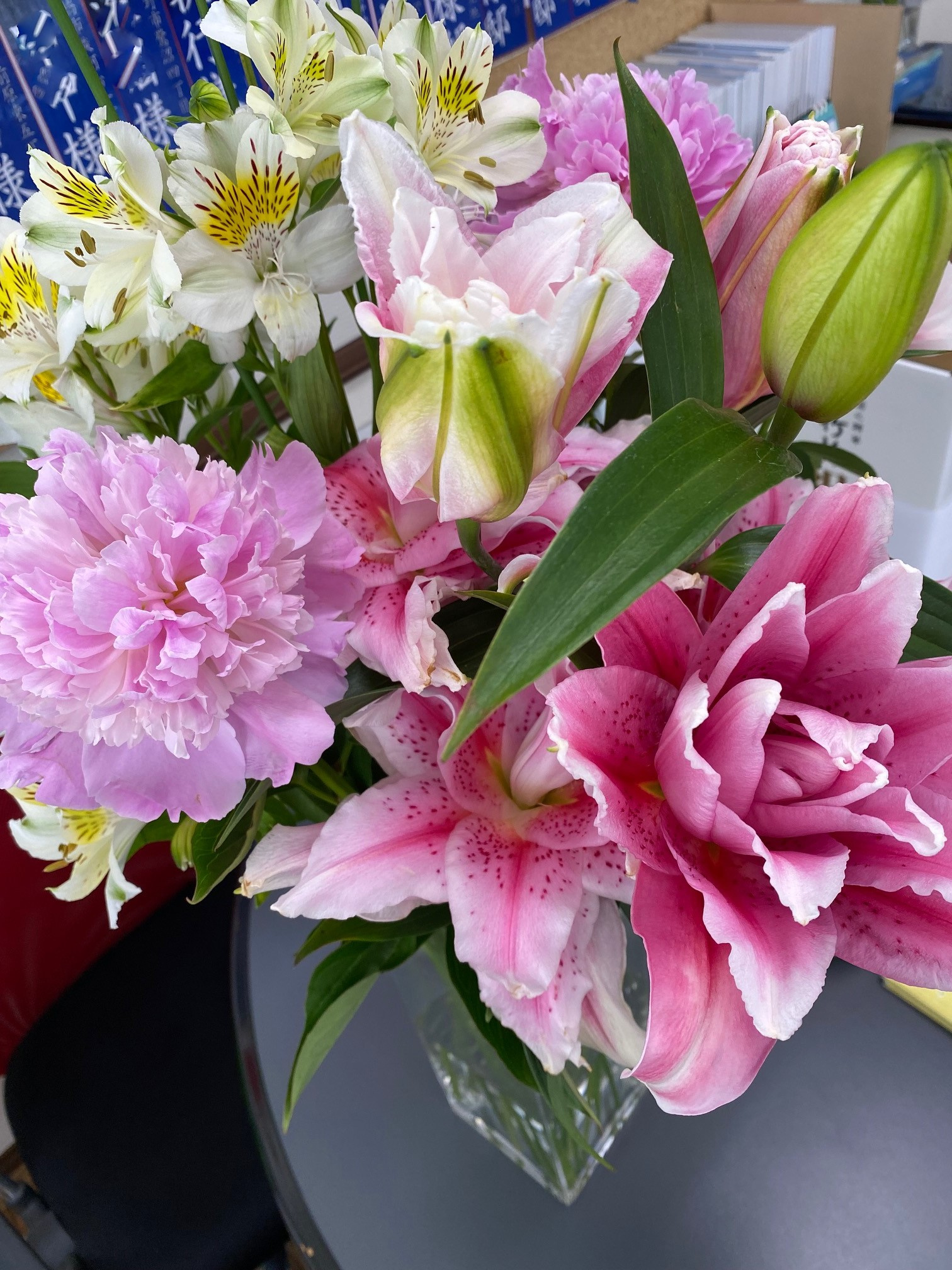 今回は大好きなシャクヤク3種類。。。。そのうえ ユリも艶やかな種類です超豪華7輪も!!